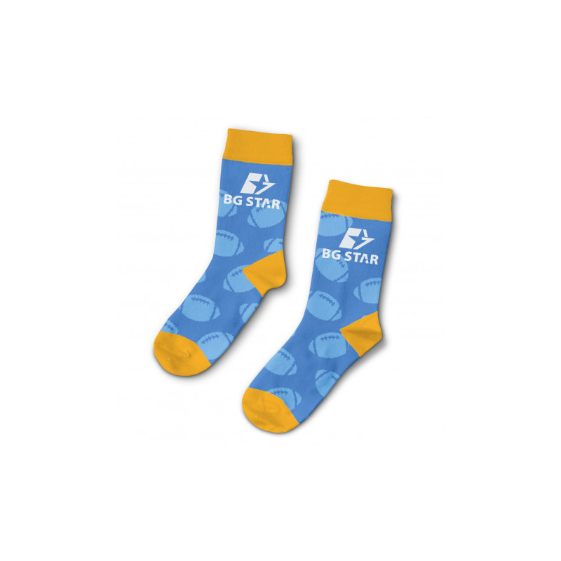Vibrant custom crew socks with full colour sublimation branding. The socks are made from 75% cotton, 22% polyester and 3% spandex and are available in two sizes. A production lead time of 25 working days applies to this product by air freight and larger orders can be sea freighted on request to reduce the freight cost.