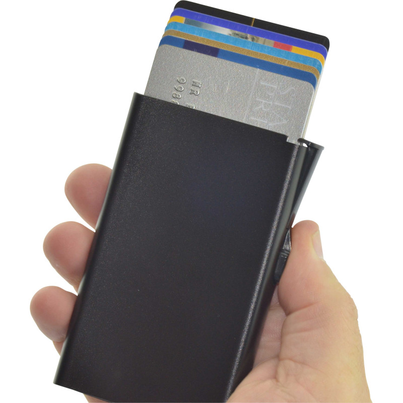 Keep up to 6 credit cards securely stored in this stylish Aluminium card holder. With the simple push of a button, the cards are neatly released for easy access. Combining ultimate convenience with the protection of RFID blocking (which prevents information contained in the chip of the card being stolen). Available in black, silver, gold, cyan or magenta.