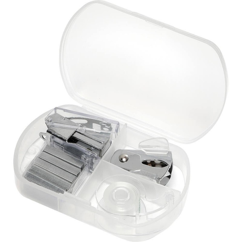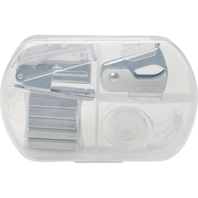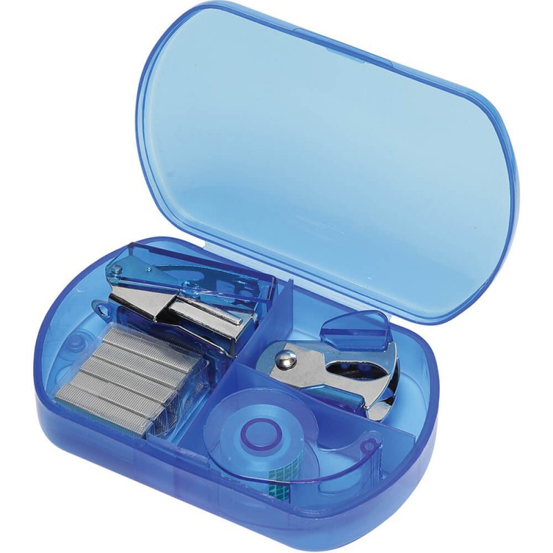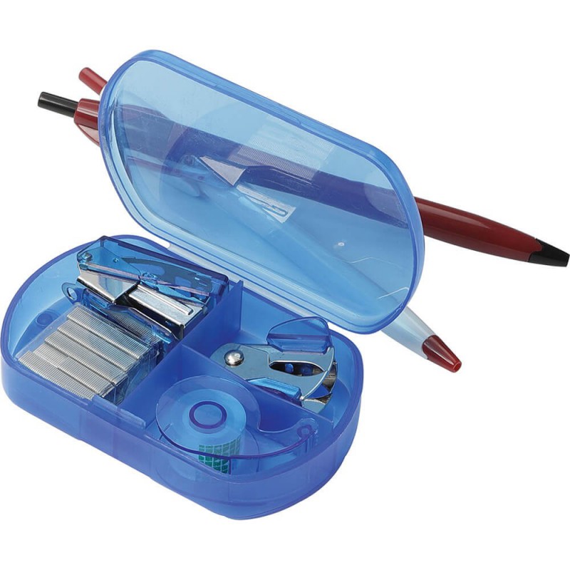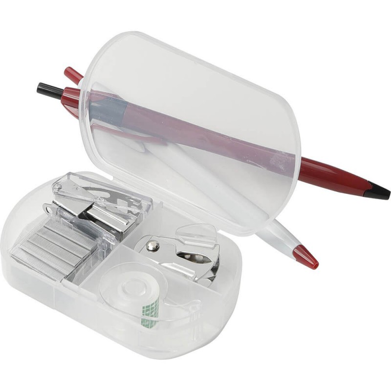 The Multi-Desktop Set includes 1-piece mechanical pencil, 1-piece ballpoint pen, 1-piece eraser, 1-piece color matching notepad and sticker, and small sticky flag in 5 colors.