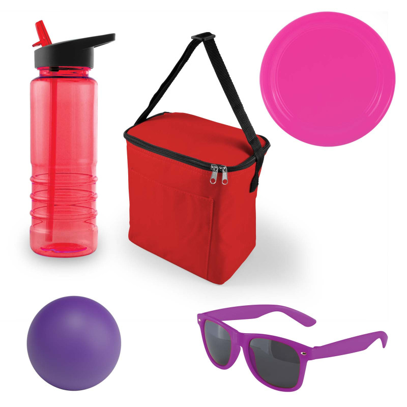 Available Colours: Hi Bounce Ball: White|Yellow|Orange|Red|Maroon|Purple|Pink|Green|Teal|Blue|Black;Flyer: White|Yellow|Red|Pink|Green|Blue;Cooler Bag: White|Yellow|Orange|Red|Green|Light Blue|Dark Blue|Black;Bottle: Clear|Yellow|Orange|Red|Green|Light Blue|Dark Blue|Charcoal;Sunglasses: White|Yellow|Orange|Red|Pink|Purple|Green|Light Blue|Dark Blue|Black