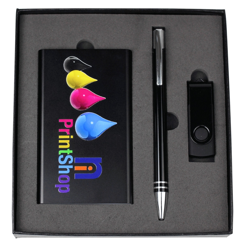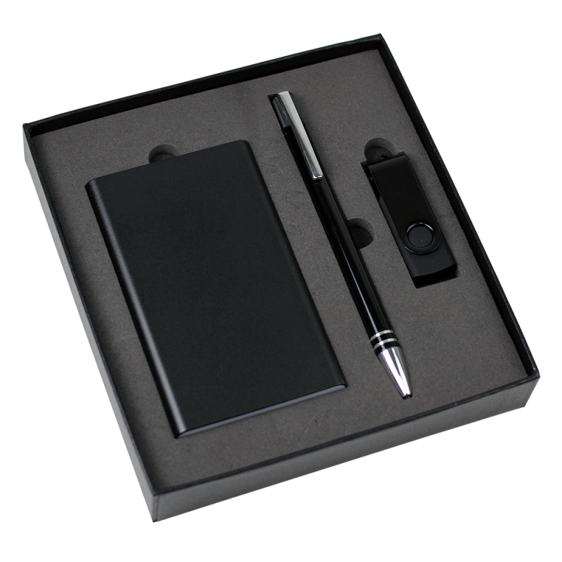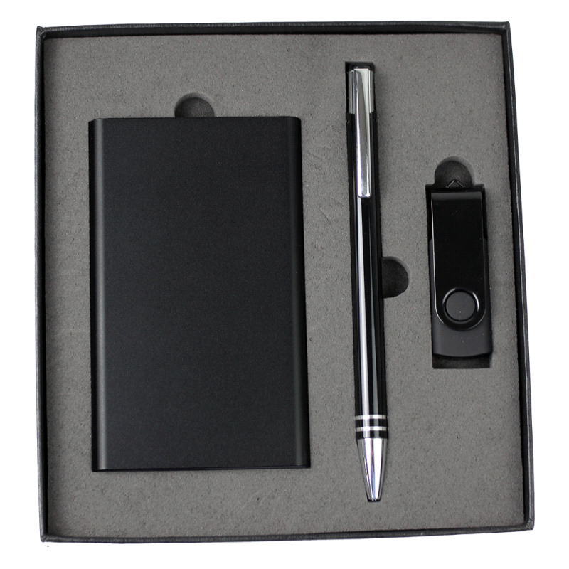 Gift set of Bling Ballpoint Pen, Velocity 2000mAh Power Bank, 4GB Swivel Flash Drive. Packed in 2 piece cardboard gift box with precision cut cardboard insert. Micro USB cable for charging included. Packaging proudly Australian Made.