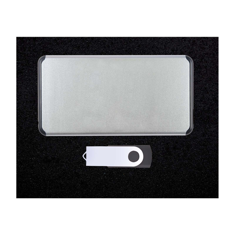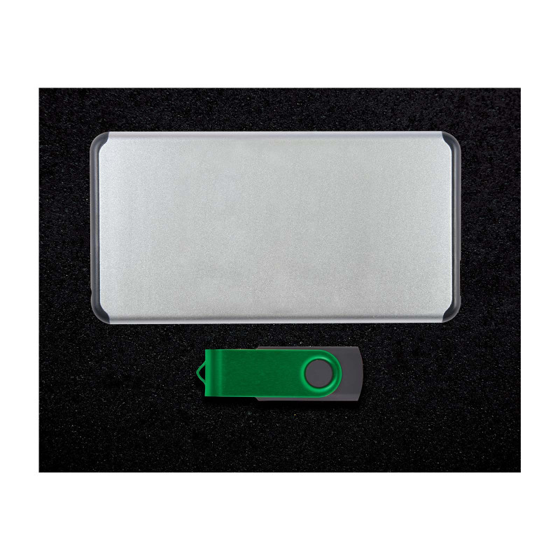 Gift set of Velocity Power Bank and 4GB Swivel Flash Drive. Packed in 2 piece cardboard gift box. With laser cut foam insert. Micro USB cable for charging comes standard.