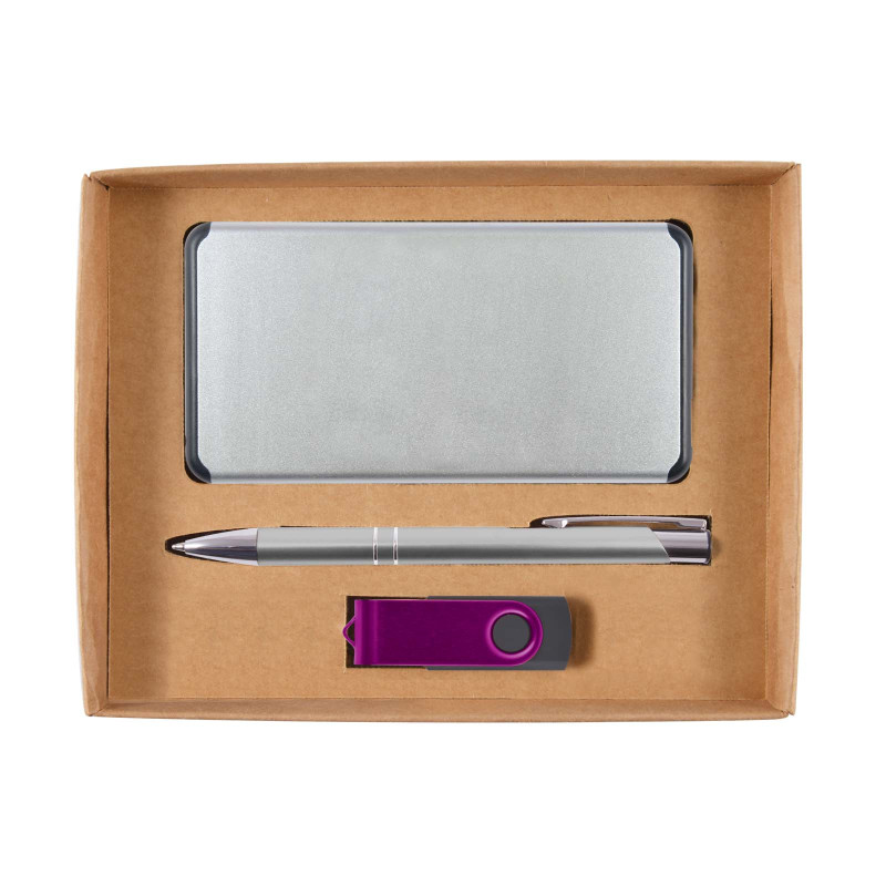 Gift set of Bling Ballpoint Pen, Velocity 2000mAh Power Bank, 4GB Swivel Flash Drive. Packed in 2 piece cardboard gift box with precision cut cardboard insert. Micro USB cable for charging included. Packaging proudly Australian Made.
