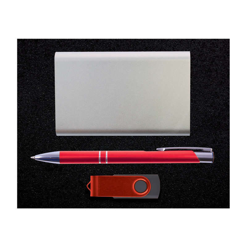 Gift set of Bling Ballpoint Pen, Velocity 2000mAh Power Bank, 4GB Swivel Flash Drive. Packed in 2 piece cardboard gift box with precision cut cardboard insert. Micro USB cable for charging included. Packaging proudly Australian Made.