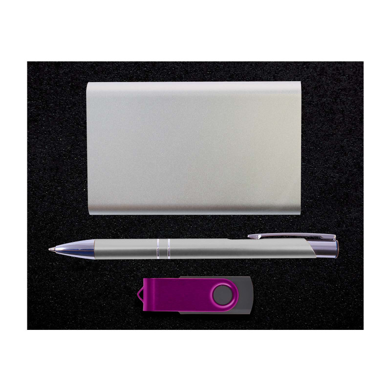 Superior gift set of 2000mAh Velocity Power Bank, Miami Ballpoint Pen and 4GB Swivel Flash Drive. Packed in 2 piece cardboard gift box with laser cut foam insert. Includes Micro USB cable for charging. 12 month limited technology warranty.
