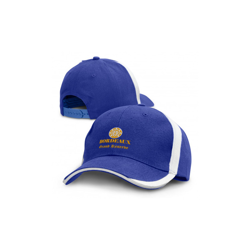 Premium quality structured five panel cap which is manufactured from 100% cotton. It features a coloured trim of your choice, embroidered eyelets, a pre-curved peak, a sweat band and an adjustable Velcro closure which allows one size to fit most people.