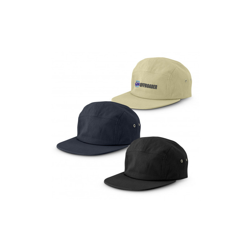 Premium quality structured five panel cap which is manufactured from 100% cotton. It features a coloured trim of your choice, embroidered eyelets, a pre-curved peak, a sweat band and an adjustable Velcro closure which allows one size to fit most people.