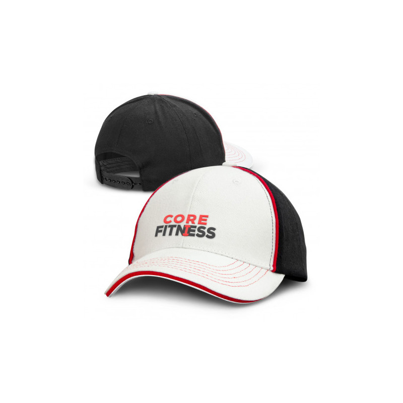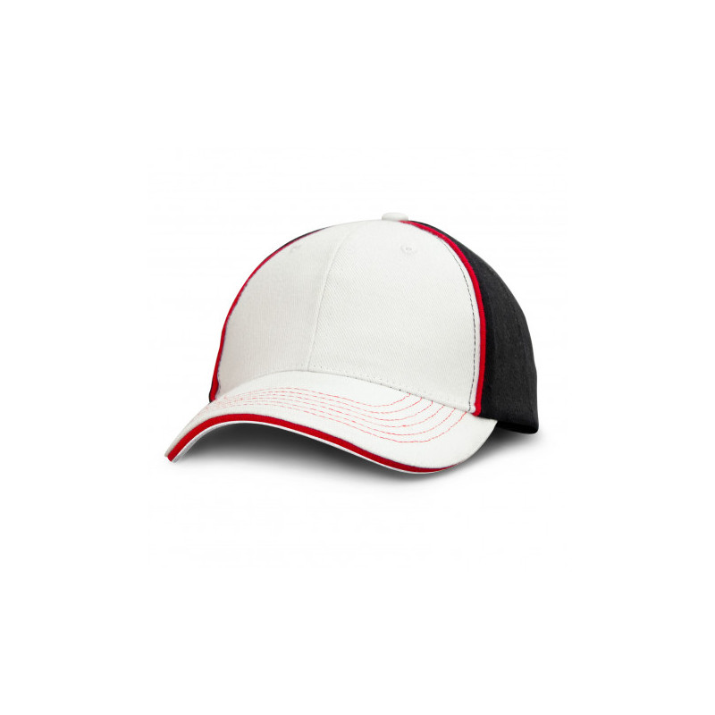 Premium quality structured five panel cap which is manufactured from 100% cotton. It features a coloured trim of your choice, embroidered eyelets, a pre-curved peak, a sweat band and an adjustable Velcro closure which allows one size to fit most people.