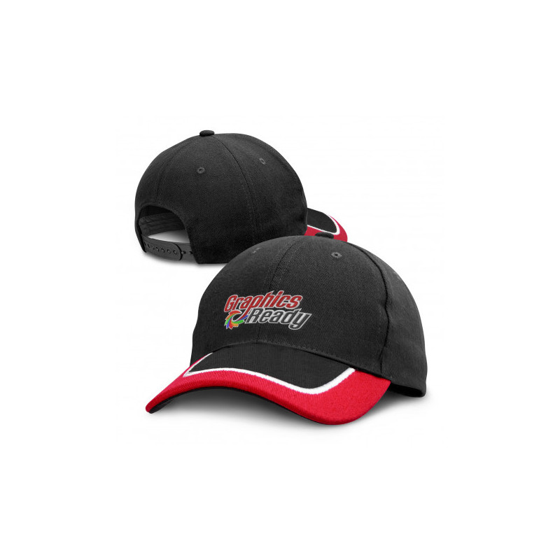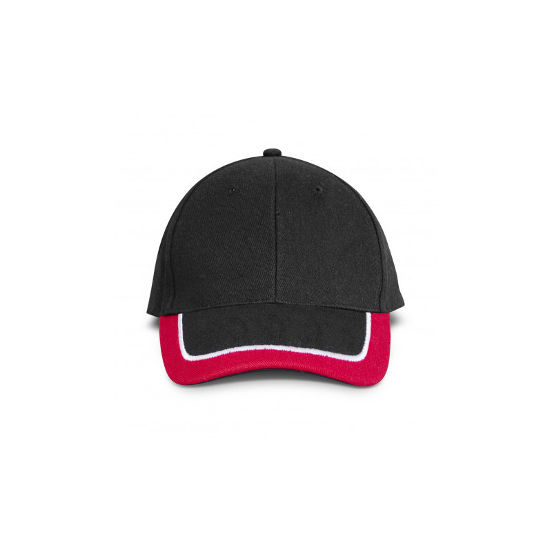 Premium quality structured five panel cap which is manufactured from 100% cotton. It features a coloured trim of your choice, embroidered eyelets, a pre-curved peak, a sweat band and an adjustable Velcro closure which allows one size to fit most people.