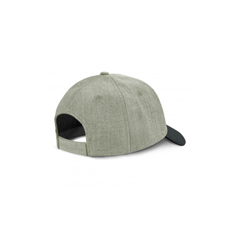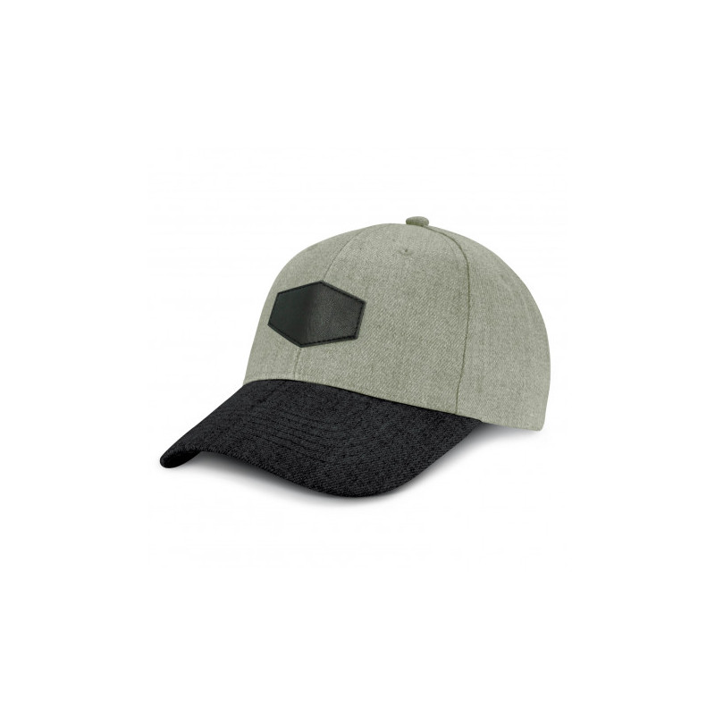 Premium structured six-panel cap which is manufactured from polyester felt. It has a fashionable curved cork peak, matching sewn-in grey eyelets, and a brass buckle at the back that allows one size to fit most people.