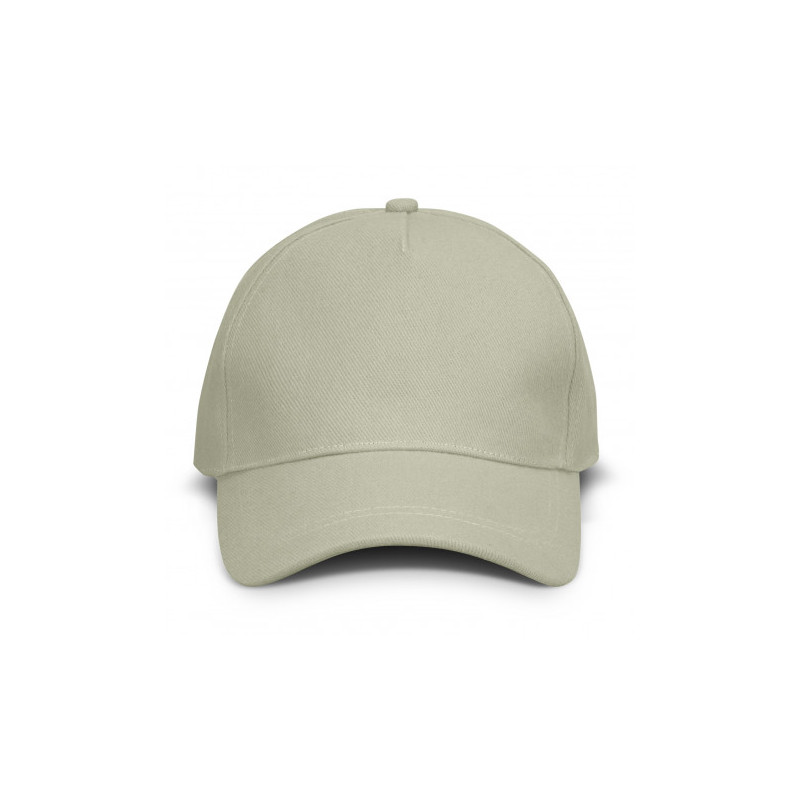Premium structured six-panel cap which is manufactured from polyester felt. It has a fashionable curved cork peak, matching sewn-in grey eyelets, and a brass buckle at the back that allows one size to fit most people.