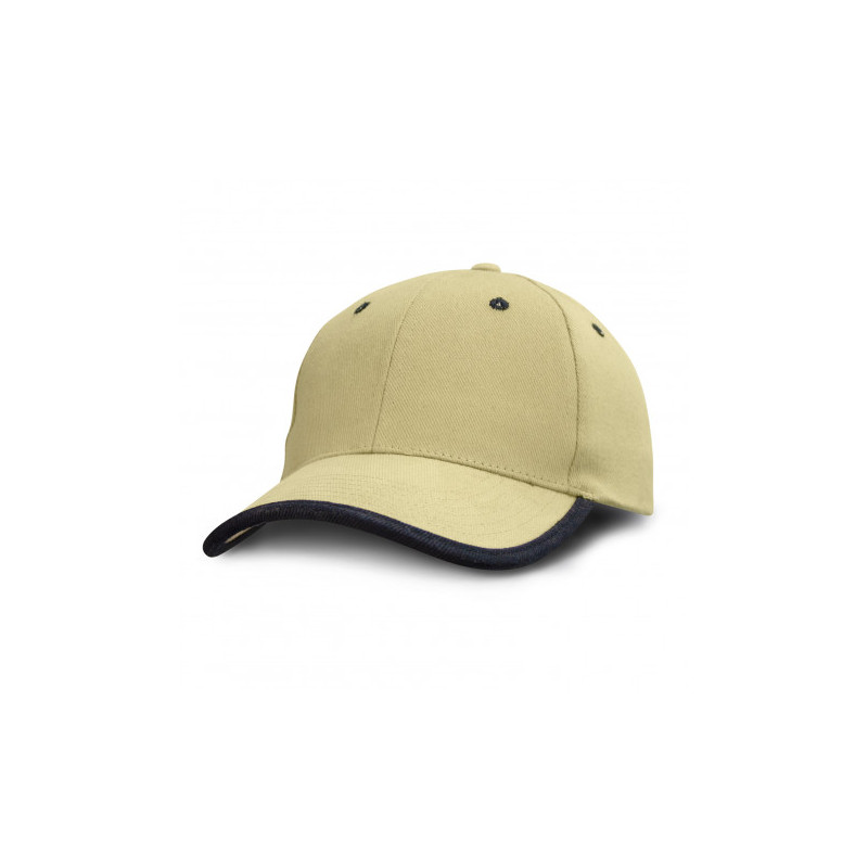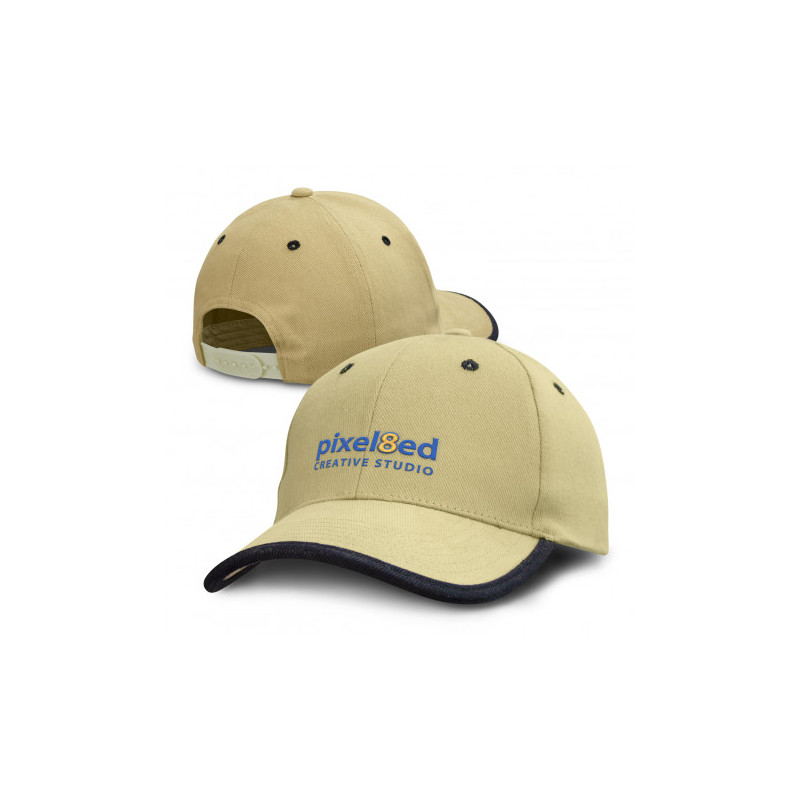 Premium quality structured five panel cap which is manufactured from 100% cotton. It features a coloured trim of your choice, embroidered eyelets, a pre-curved peak, a sweat band and an adjustable Velcro closure which allows one size to fit most people.