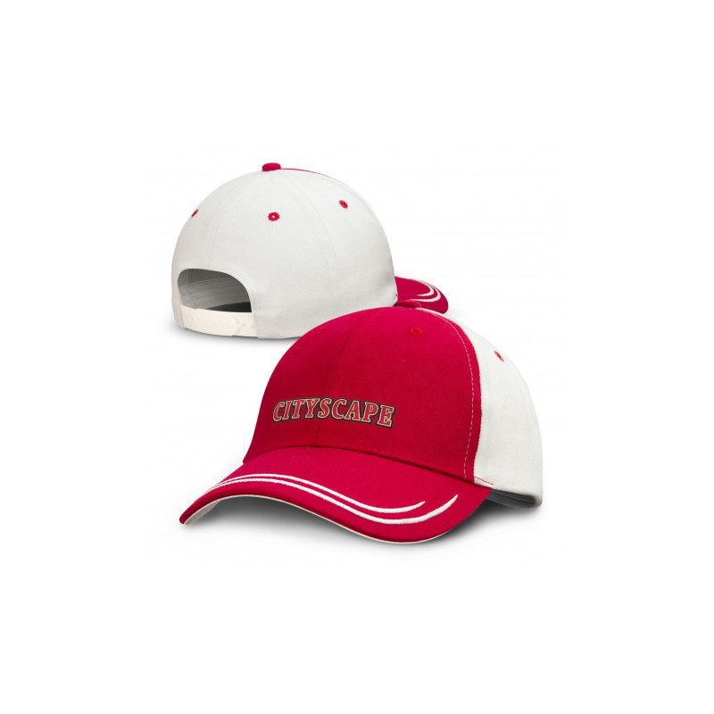 Premium quality structured five panel cap which is manufactured from 100% cotton. It features a coloured trim of your choice, embroidered eyelets, a pre-curved peak, a sweat band and an adjustable Velcro closure which allows one size to fit most people.