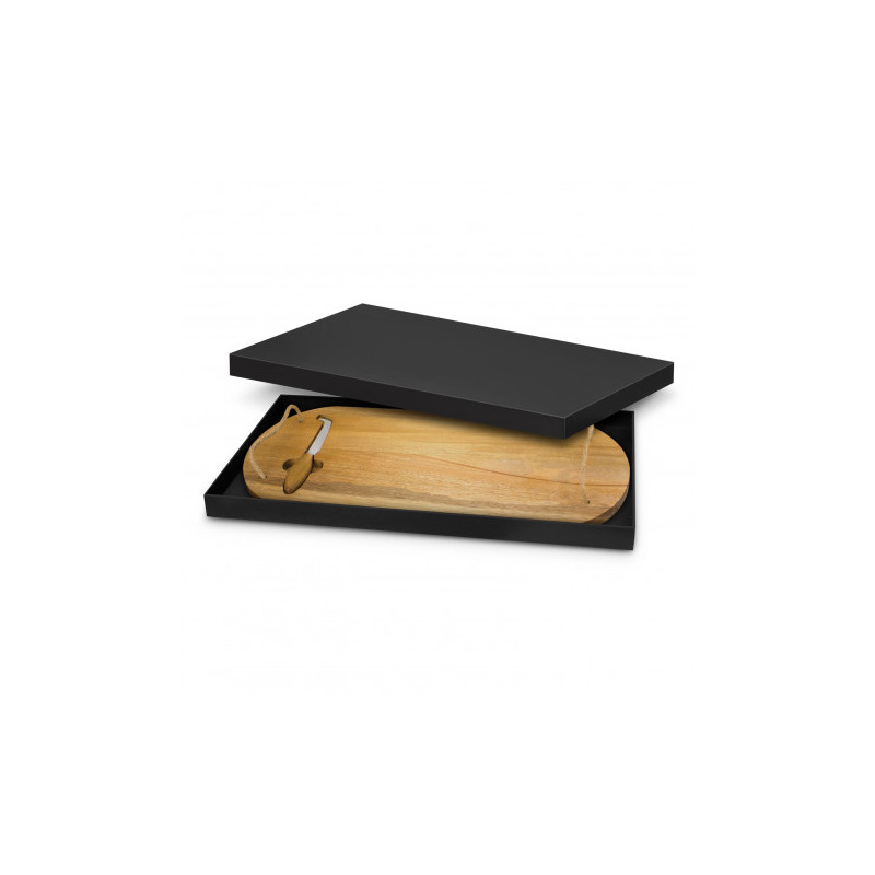 Stylish serving board made from natural acacia wood, presented in a natural gift box with a Keepsake branded sleeve.
