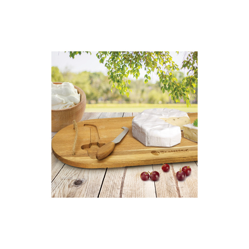 Tasteful bamboo cheese board which swivels open to reveal two cheese knives and a cheese fork neatly stored inside. Wood is a natural material which produces unavoidable variances in the grain pattern, colour and branding.