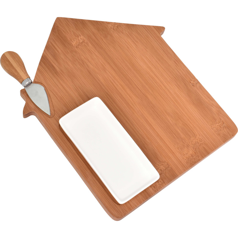 Tasteful bamboo cheese board which swivels open to reveal two cheese knives and a cheese fork neatly stored inside. Wood is a natural material which produces unavoidable variances in the grain pattern, colour and branding.