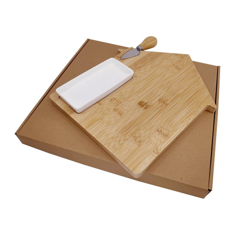 Quality square bamboo cheese board with a slide out cutlery drawer including two cheese knives and a cheese fork. Kensington is presented in a natural packaging with NATURA branding.