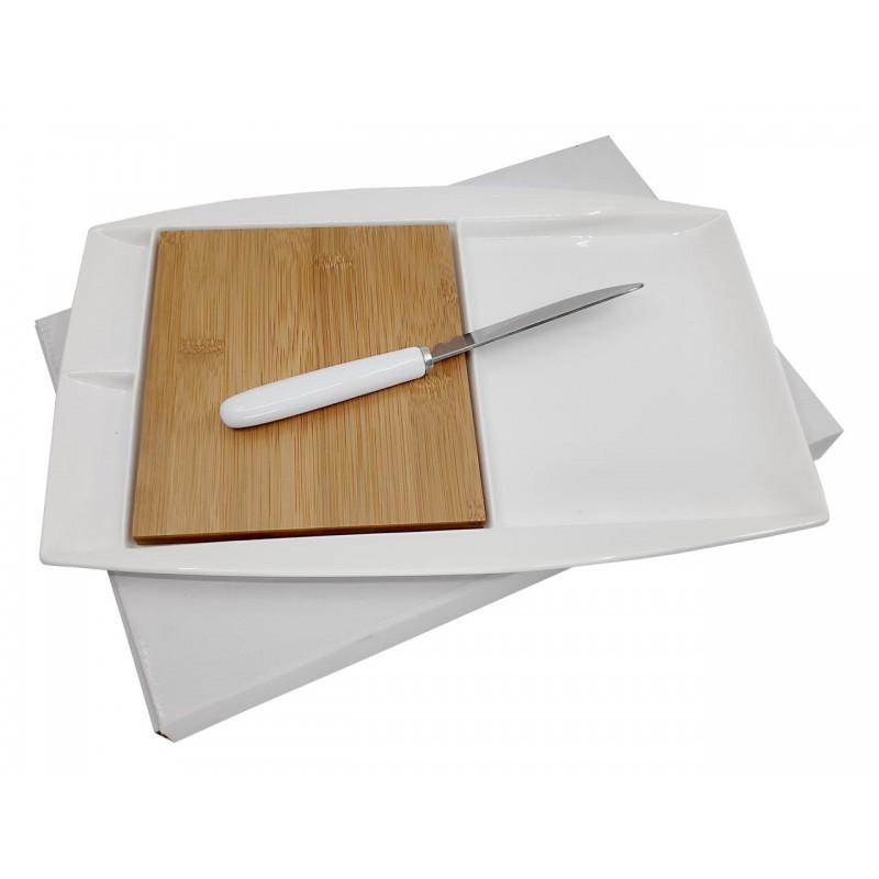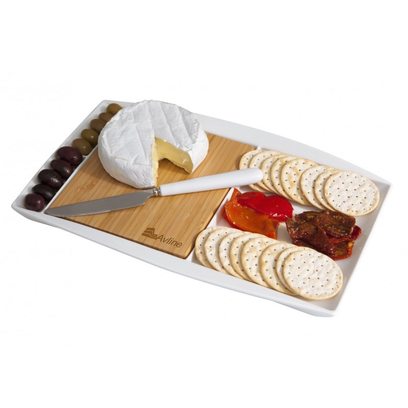 Tasteful bamboo cheese board which swivels open to reveal two cheese knives and a cheese fork neatly stored inside. Wood is a natural material which produces unavoidable variances in the grain pattern, colour and branding.