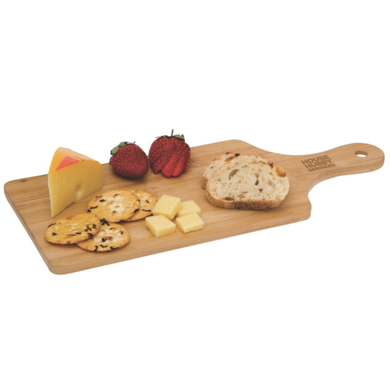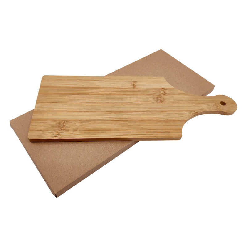 Bamboo cutting board with integrated handle and hole for hanging. Can be used in a variety of ways as a cheese board, pizza board or a charuterie board. Its flat surface and ample space is ideal for arranging a variety of foods. The integrated handle and hanging hole make it easy to store and access.