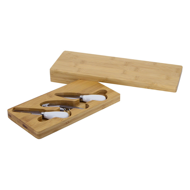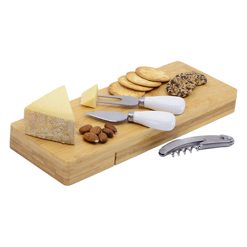 Tasteful bamboo cheese board which swivels open to reveal two cheese knives and a cheese fork neatly stored inside. Wood is a natural material which produces unavoidable variances in the grain pattern, colour and branding.