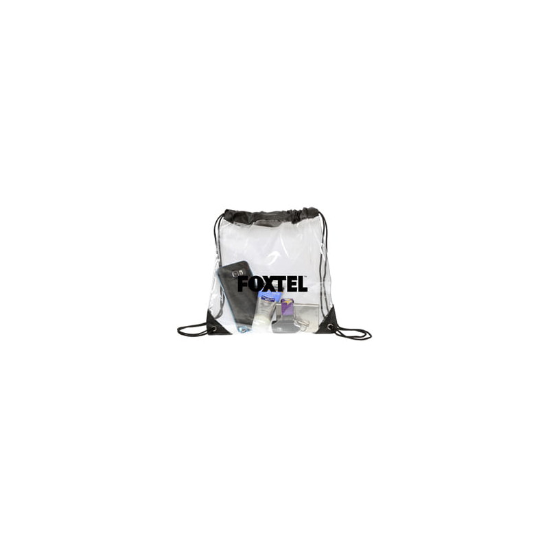 25C clear PVC drawstring backpack, polyester top edge. A perfect bag to meet security regulations for sporting events, concerts, races and more. This PVC bag is also a great bag for every day uses such as shopping, beach, and swimming.