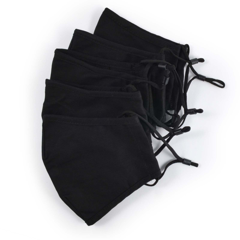 Pack of 5 polyester/spandex face masks that are washable and reusable time and again. Designed for breathability when you are active. Each cooling mask is 3 layers. Made from an outer layer of 90% polyester & 10% spandex and 2 inner layers of 100% poly cotton. Washable and reusable time and again. For an extra comfortable fit two black elastic over ear...