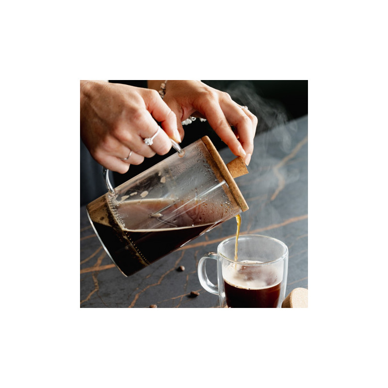 Stylish 850ml coffee plunger made from borosilicate glass with a unique square handle. The plunger features a natural bamboo lid with a silicone seal, and is presented in natural packaging with NATURA branding.