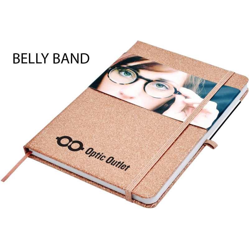 These stylish A5 notebooks are guaranteed to receive attention. Featuring a natural coloured Bonded Leather hard cover with edge stitching, 9mm wide natural coloured elastic closure, pen loop, marker ribbon and 192 pages of high quality cream paper. Notebook Gift Box is optional extra - see W17. LOGO TAG OPTION: Our latest decorating technique for this...