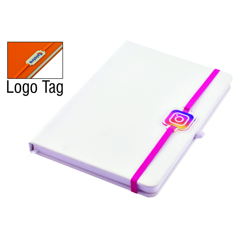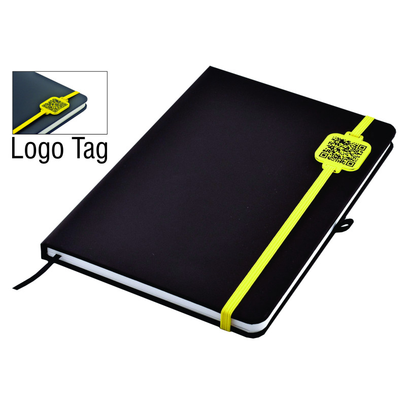 These stylish A6 notebooks are guaranteed to receive attention. Featuring a natural coloured Bonded Leather hard cover with edge stitching, 9mm wide natural coloured elastic closure, pen loop, marker ribbon and 192 pages of high quality cream paper. LOGO TAG OPTION: Our latest decorating technique for this notebook is the addition of a LogoTag. Made from...