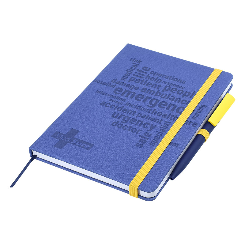 This quality A5 notepad features a leather-feel PU cover, colour co-ordinated elastic closure and designer matching pen. Available in blue, red and black. DIGITAL PRINTING OPTION: A slightly raised print effect is achieved automatically when printing in White or printing in Colour on top of a printed White base. If you require a Thick Raised Print please...
