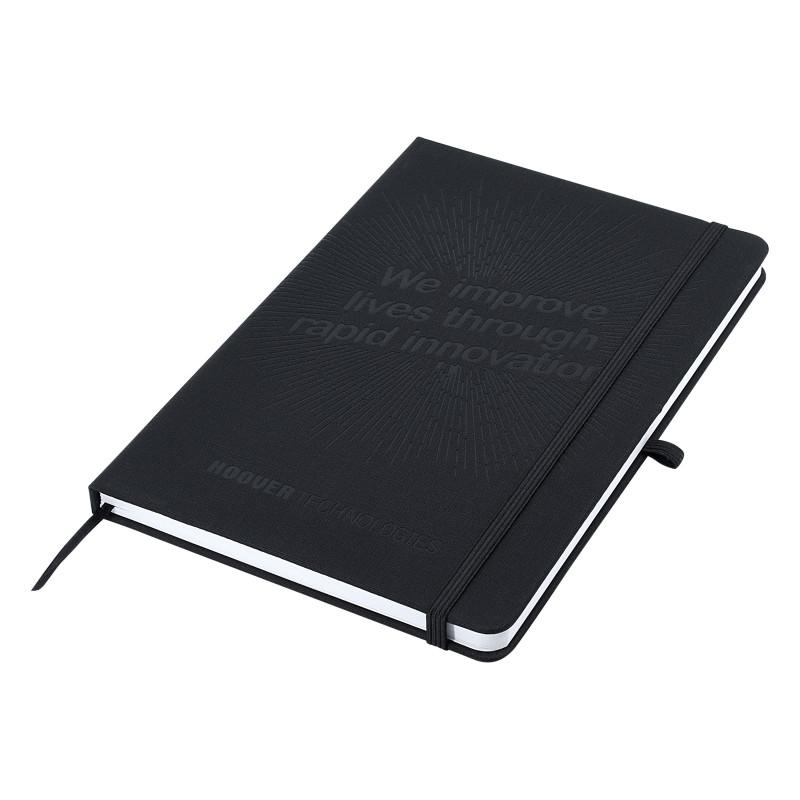 This quality A5 notepad features a soft leather-feel cover, elastic closure, ribbon marker and cream coloured lined pages. Available in black, navy and white, all with black elastic. Optional Gift Box W17 available. If youre after a debossed notebook, check these out!