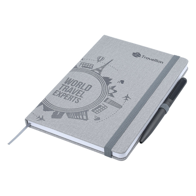 Montreal A5 Notebook truly raises the bar when it comes to both quality and style. Featuring a pen sleeve (pen additional), magnetic closure and textured linen surface, this notebook will surely make an impact. Available in black or navy. Notebook Gift Box is optional extra - see W17. If youre after a debossed notebook, check these out!