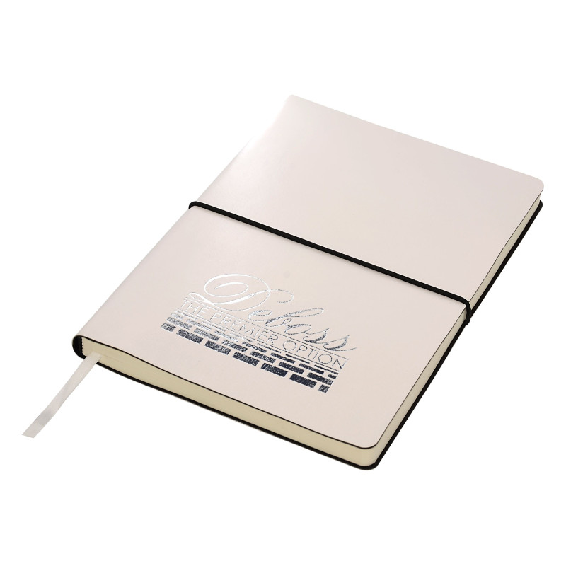 These stylish A5 notebooks are guaranteed to receive attention. Featuring a natural coloured Bonded Leather hard cover with edge stitching, 9mm wide natural coloured elastic closure, pen loop, marker ribbon and 192 pages of high quality cream paper. Notebook Gift Box is optional extra - see W17. LOGO TAG OPTION: Our latest decorating technique for this...