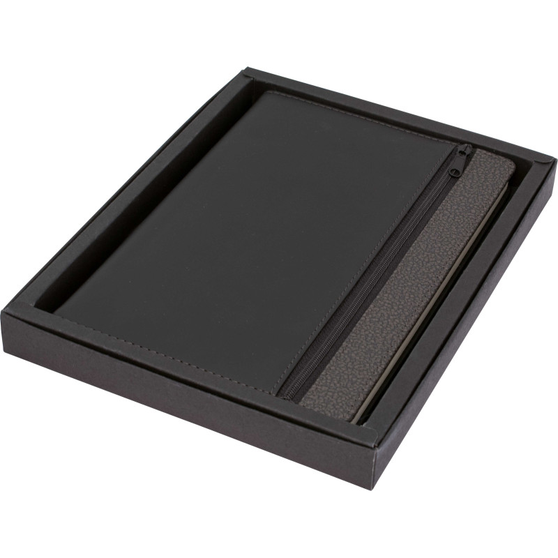 Vancouver’s contemporary styling and dimpled texture surface combine to make this A5 notebook a standout. Featuring a contrasting pen recess (pen additional) with elastic loop as well as a marker ribbon, Vancouver is available in black with grey highlight. Notebook Gift Box is optional extra - see W17
