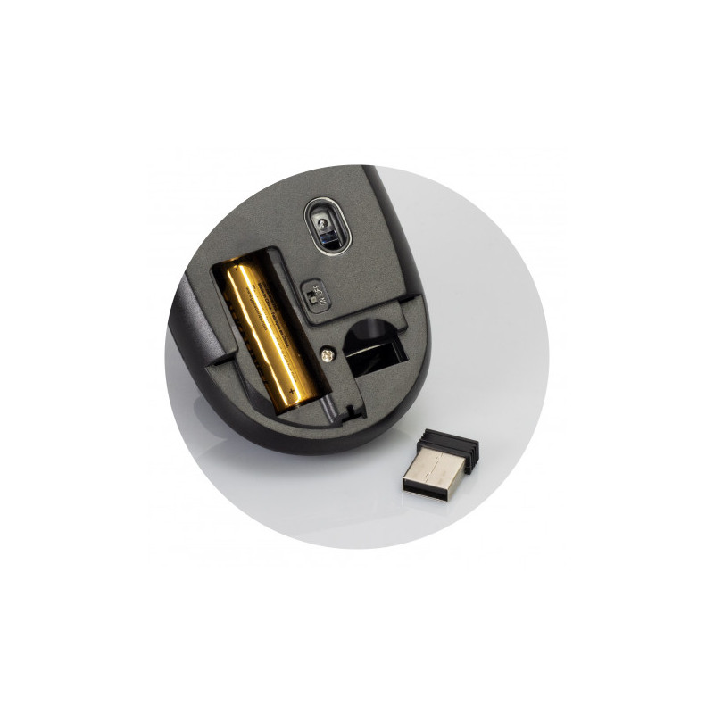 2.4G wireless optical mouse, nano receiver, power save mode, adjustable resolution 800, 1200, 1600 DPI, working range of up to 10m, powered by 2 x AAA batteries supplied Certifications: CE, FCC, USB2.0