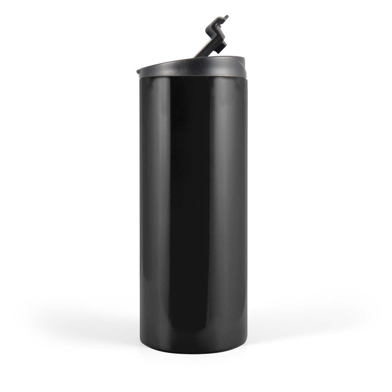 300ml Double wall stainless steel cup with black liner. Suitable for hot or cold drinks with splash proof sliding closure. Base has a foam surface protector. BPA free. Packed in a kraft gift box. For logo longevity hand washing is recommended.