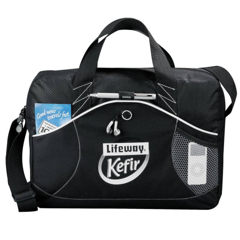 600D polyester conference bag with front zippered compartment, carry handle and mobile phone pocket Supplied in polybag. Please note a standard digital transfer CMYK cannot be exactly PMS matched.