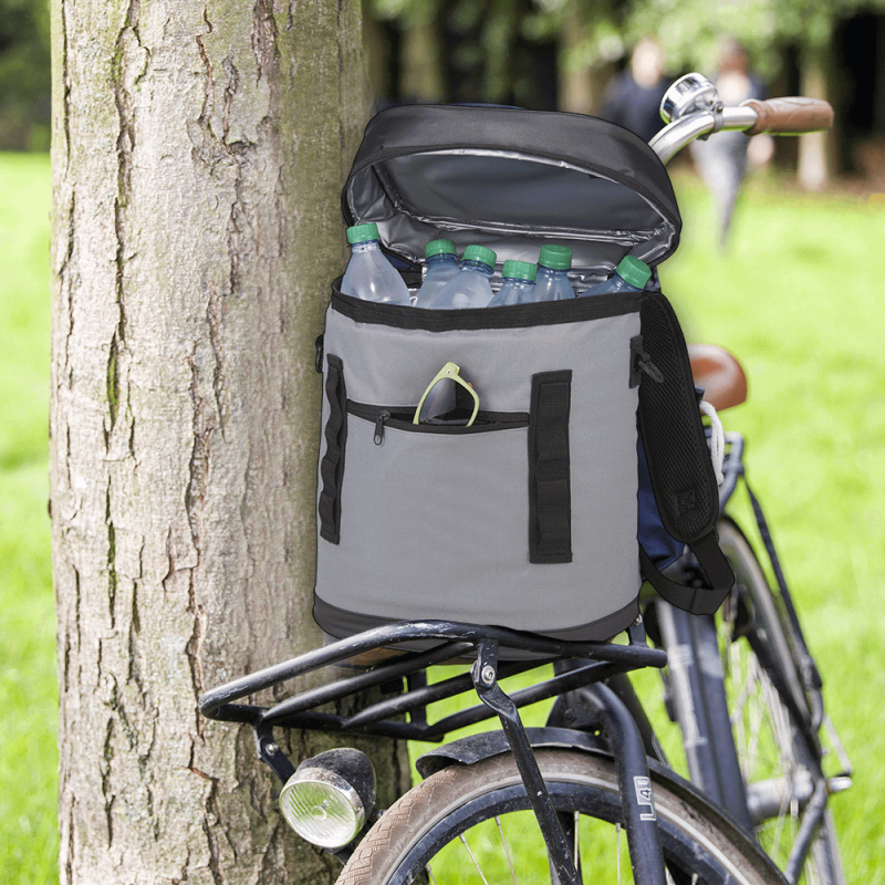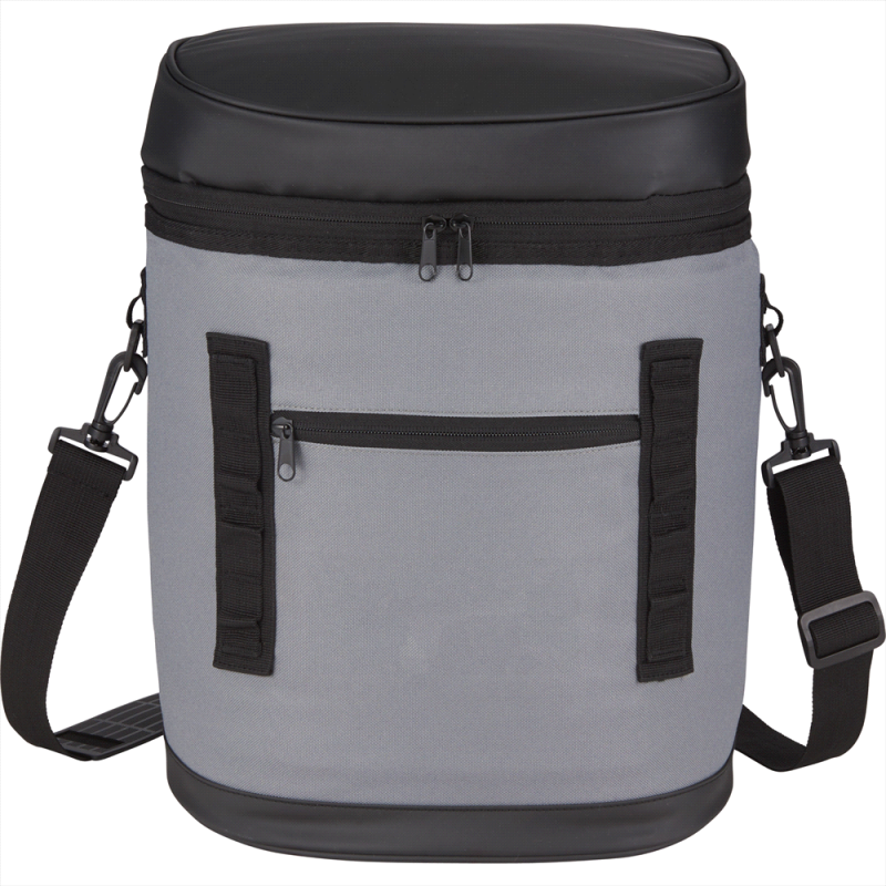 Robust large 18L cooler bag which is manufactured from 210D polyester with aluminium foil laminated PE foam insulation. It has a zippered top closure, reinforced woven handles and a large front slip pocket.