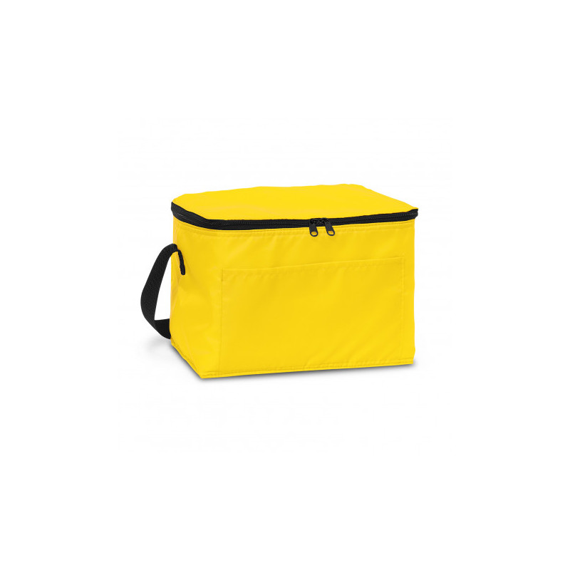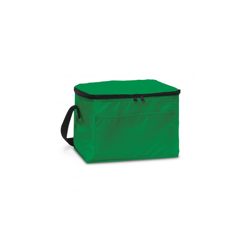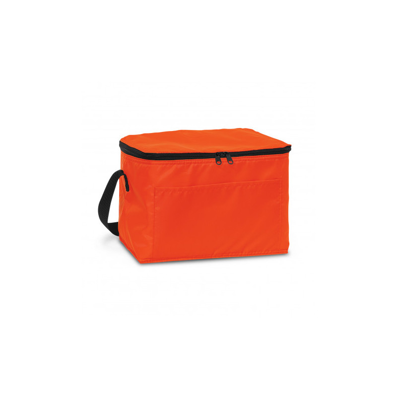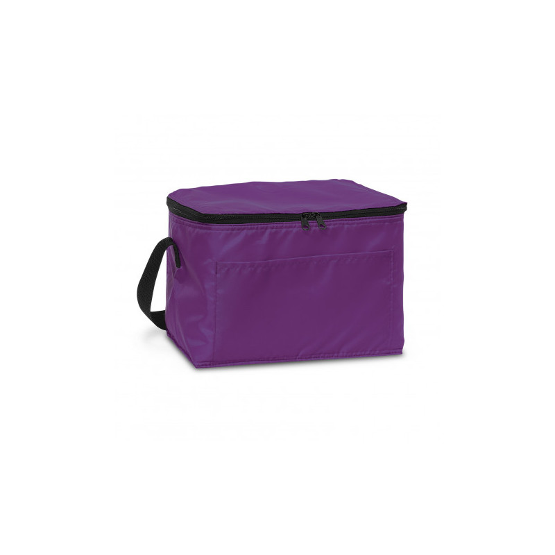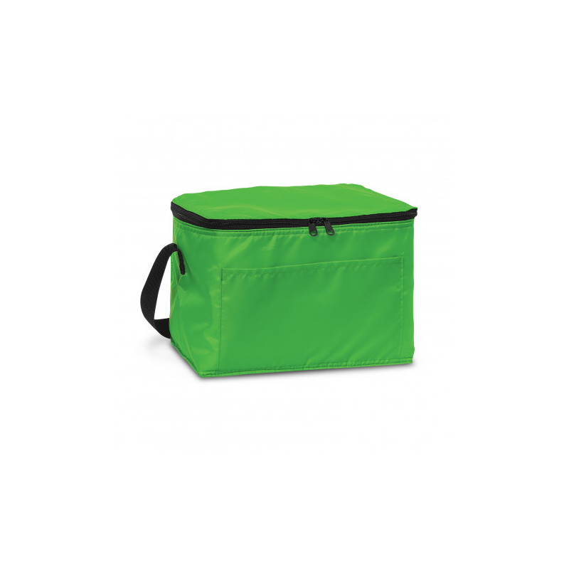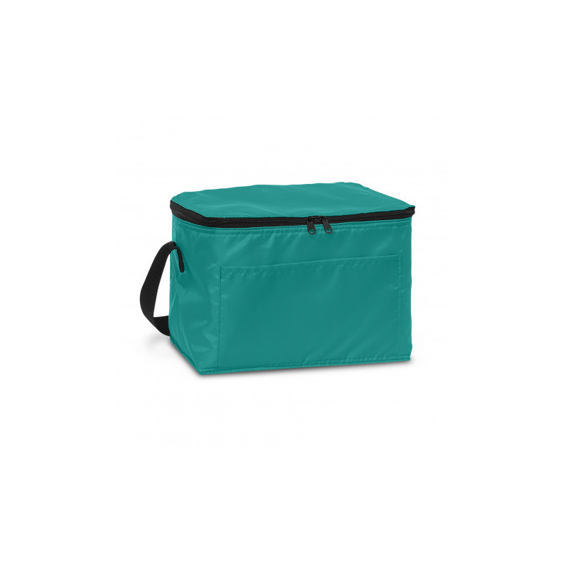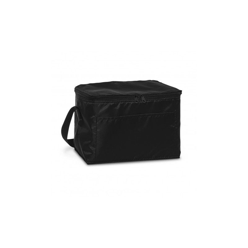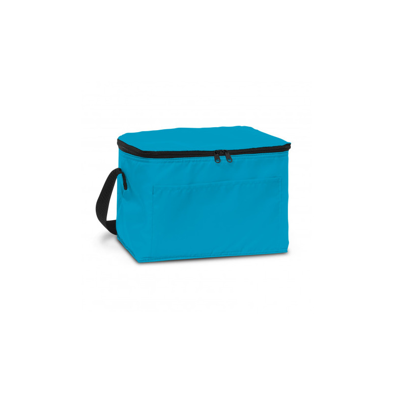 The Brisk 6 Can lunch cooler features a unique closure to secure your lunch while on the go. Made of non-woven material with a 210d front pocket and a foil lining. A plastic grab handle and flap that passes through and secures with a hook and loop closure.