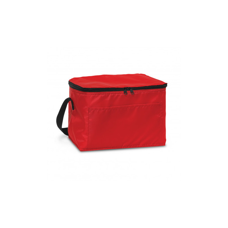 The Classic 6-Can Cooler has PEVA insulation and a zippered main compartment. Additional features include a front open pocket and an adjustable shoulder strap.