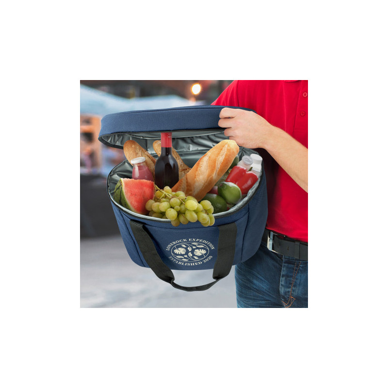 Zippered main compartment holds 36 cans. Easy access front pocket. Insulated leak proof PEVA lining. Main compartment capacity is approximately 25 litres.