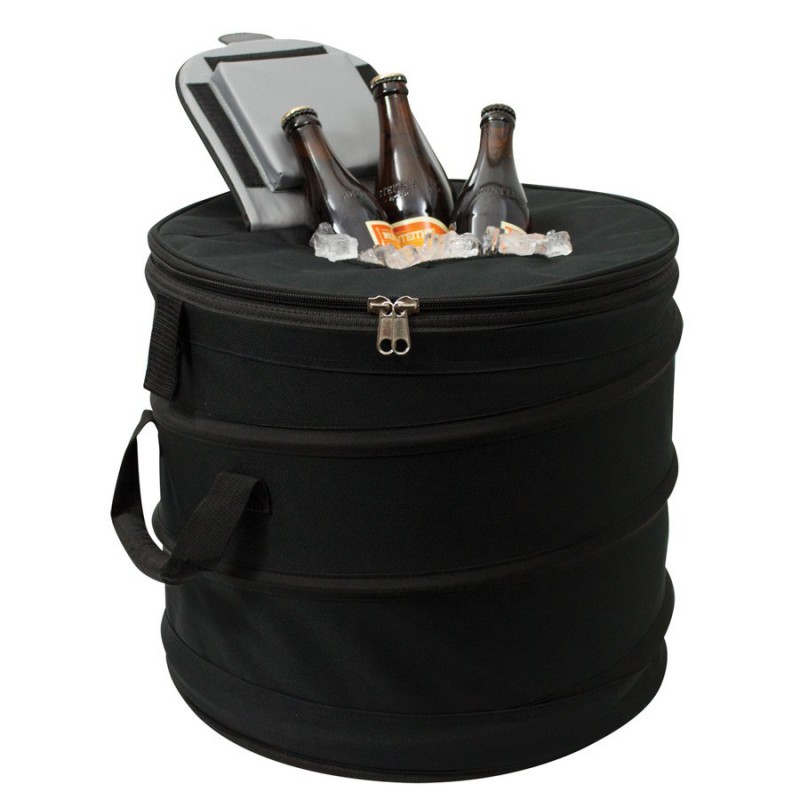 600D Nylon foldable cooler bag/tub with thermal insulation, zippered main compartment, easy clean leak proof liner and top access lid. Velcro straps hold folded bag flat for storage