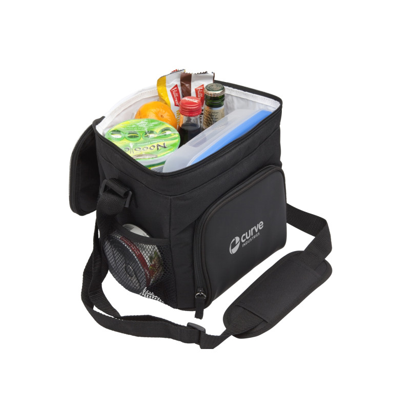 Insulated with heat-sealed water-resistant lining. Zippered main compartment. Open front pocket with three utensil sleeves. Reinforced webbing strap.