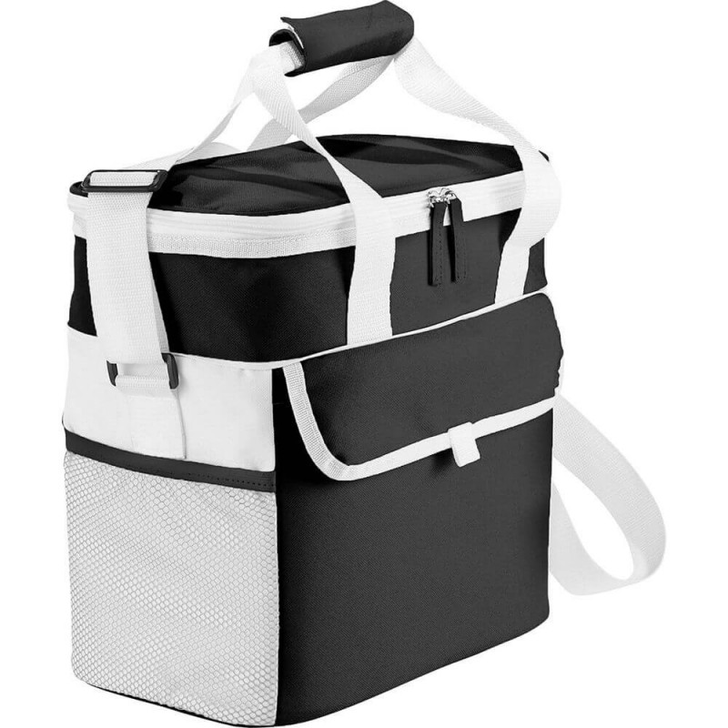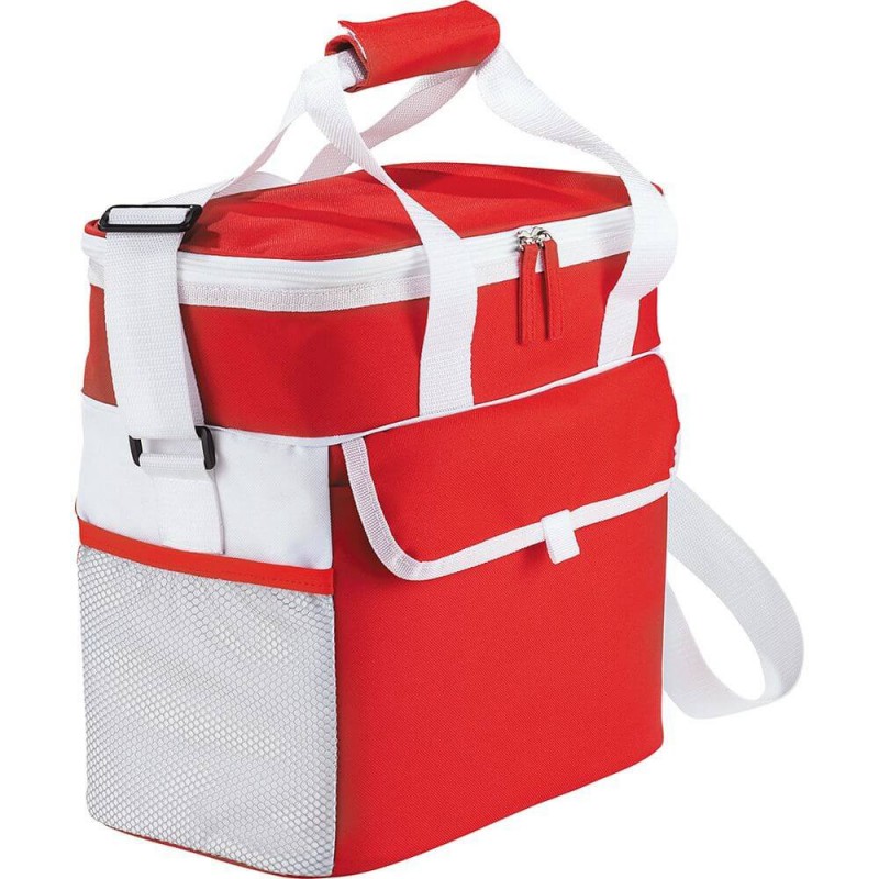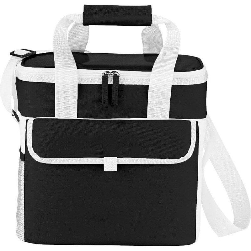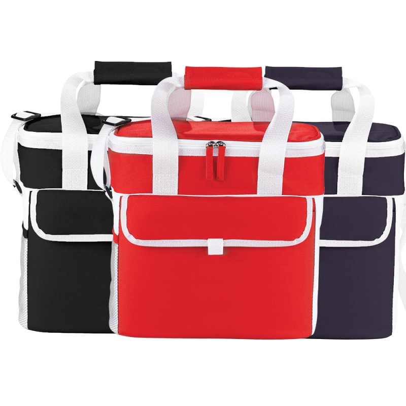 Robust large 18L cooler bag which is manufactured from 210D polyester with aluminium foil laminated PE foam insulation. It has a zippered top closure, reinforced woven handles and a large front slip pocket.
