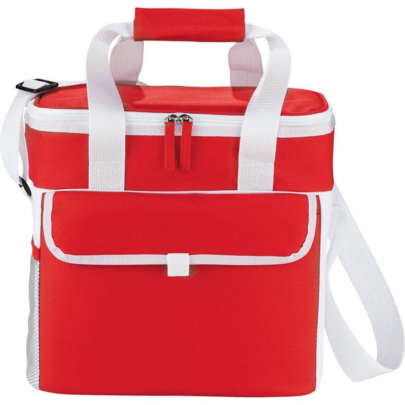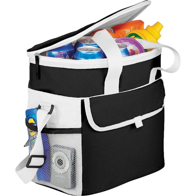 Large main zippered compartment holds up to 30 cans. Available in 2 colours.