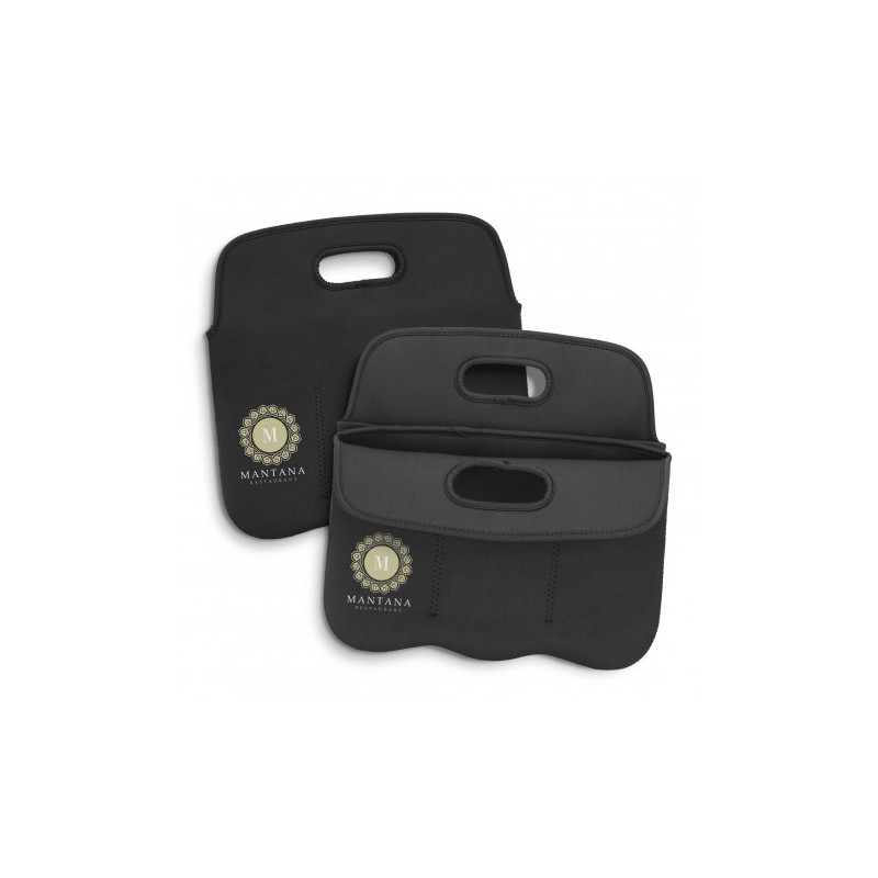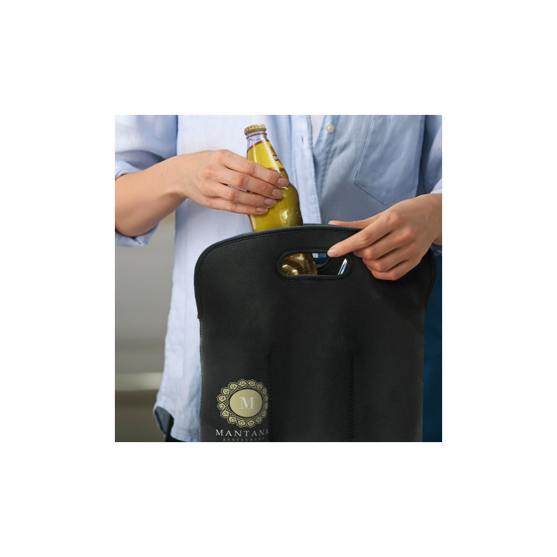 Convenient carry bag for carrying two bottles of wine and keeping them cool while in transit. It is manufactured from neoprene which has excellent insulation properties and features separated compartments for added safety. It has smart black stitched reinforcing around the handles and opening.