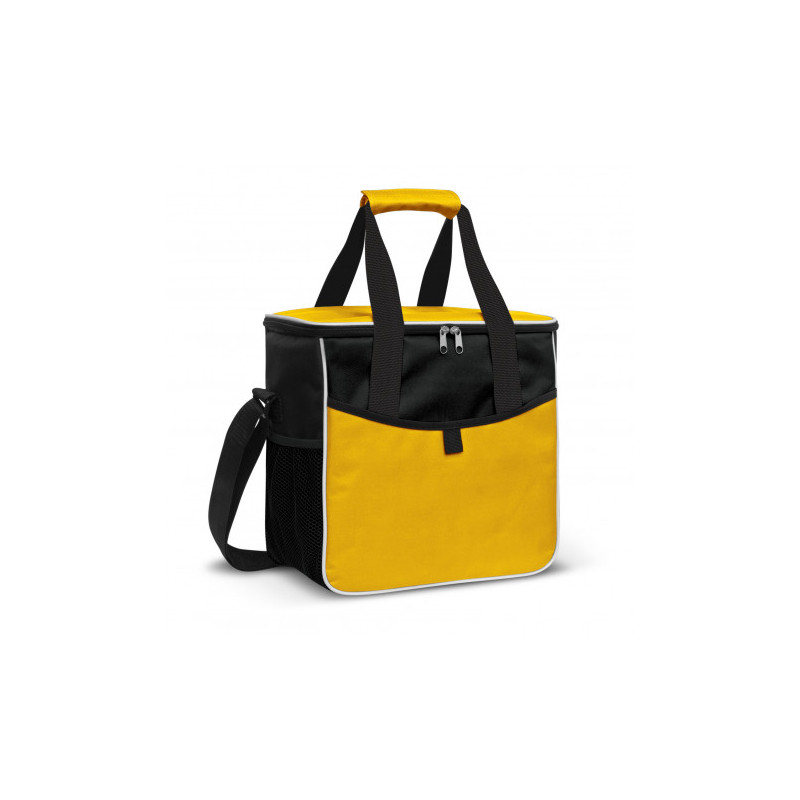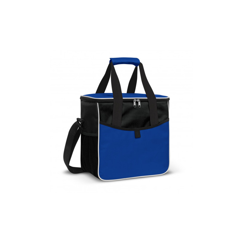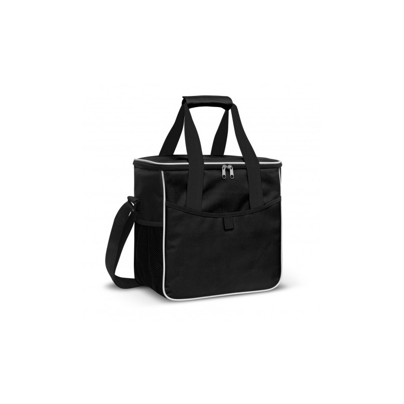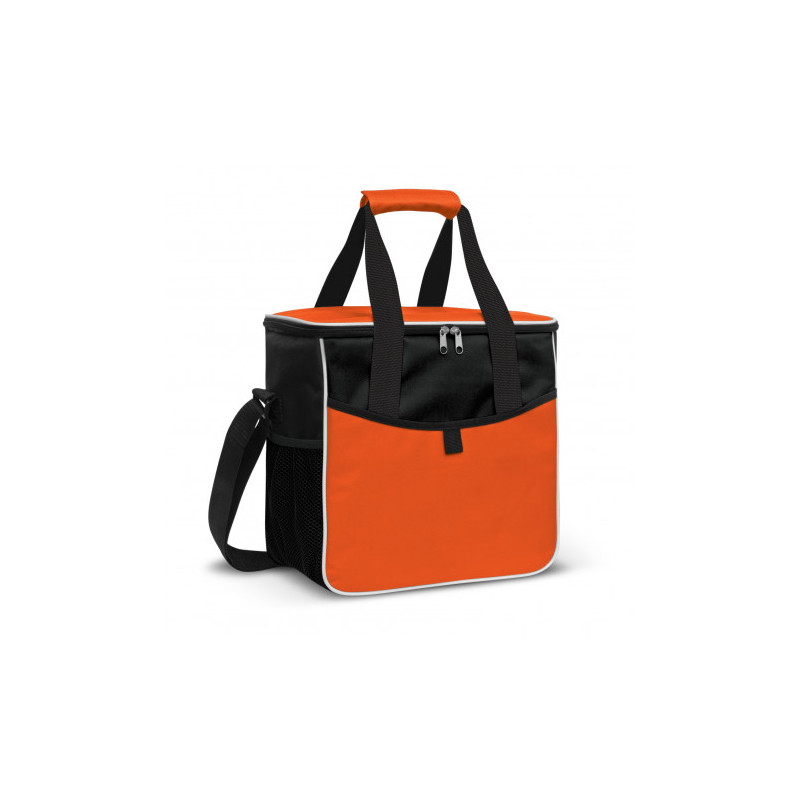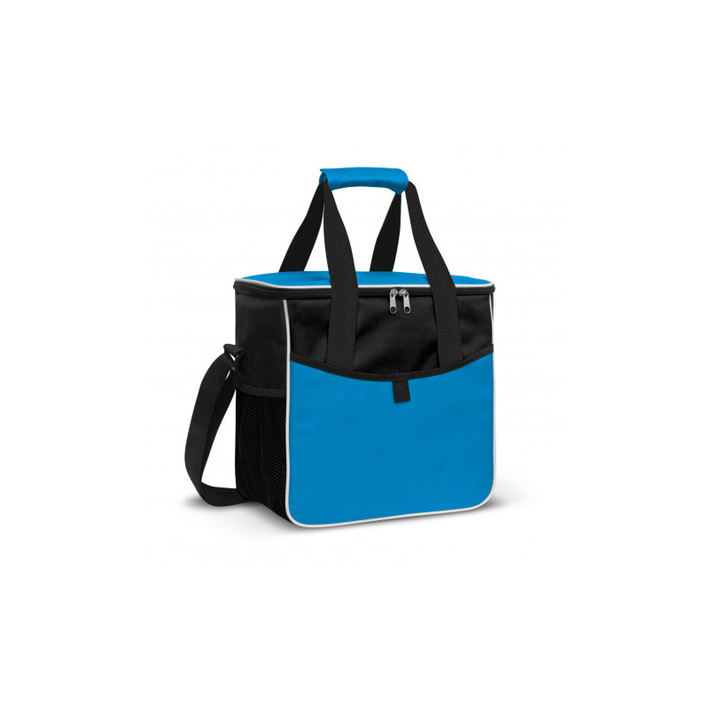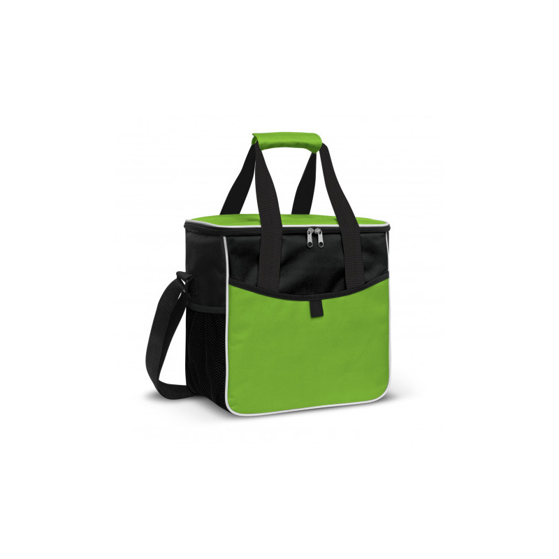 Robust large 18L cooler bag which is manufactured from 210D polyester with aluminium foil laminated PE foam insulation. It has a zippered top closure, reinforced woven handles and a large front slip pocket.