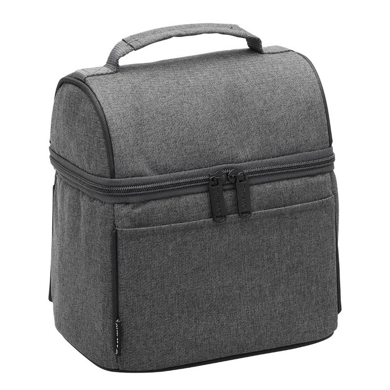 Insulated with heat-sealed water-resistant lining. Zippered main compartment. Open front pocket with three utensil sleeves. Reinforced webbing strap.