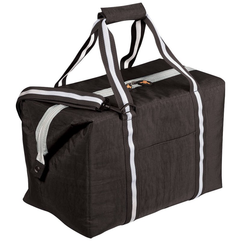 PEVA insulation. Zippered main compartment. Open front pocket. Side mesh pocket. 27-inch handle.
