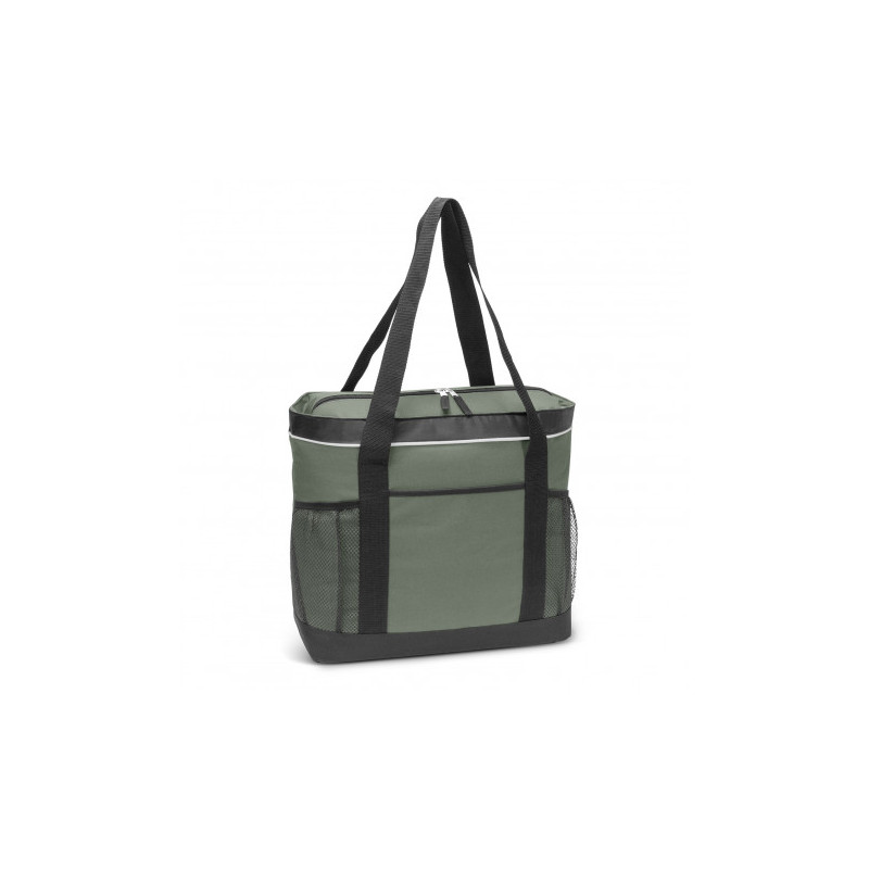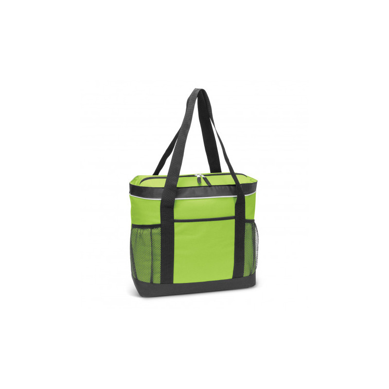 Robust large 18L cooler bag which is manufactured from 210D polyester with aluminium foil laminated PE foam insulation. It has a zippered top closure, reinforced woven handles and a large front slip pocket.